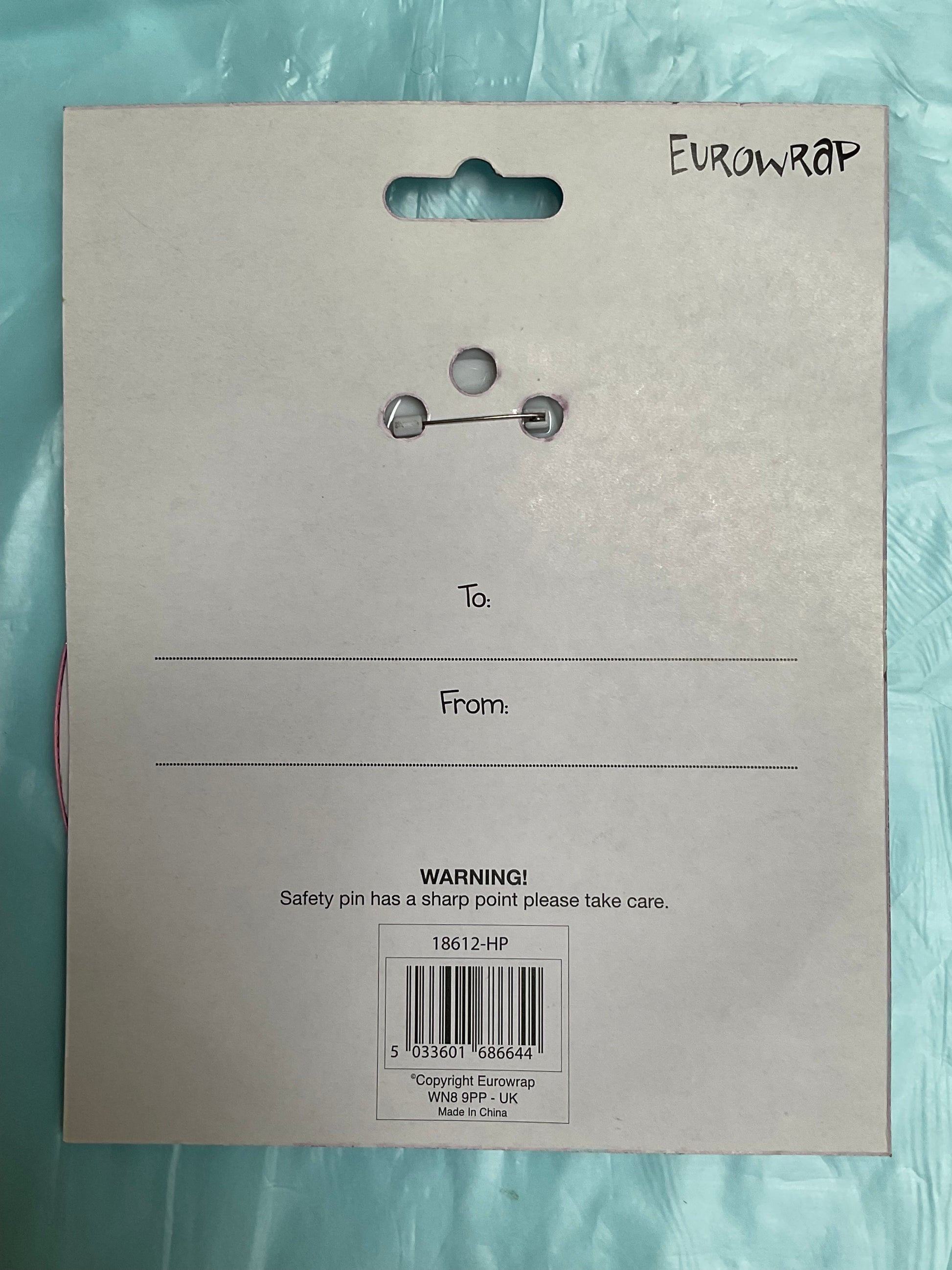 Carded with a pin to wear and a cardboard stand for display